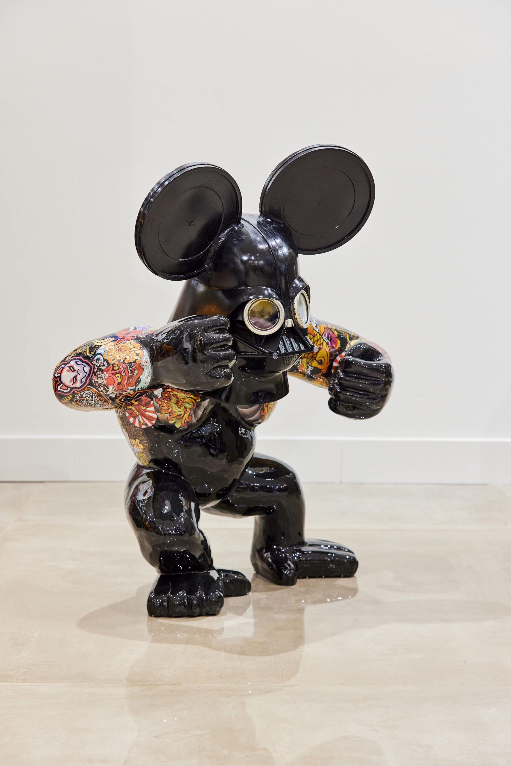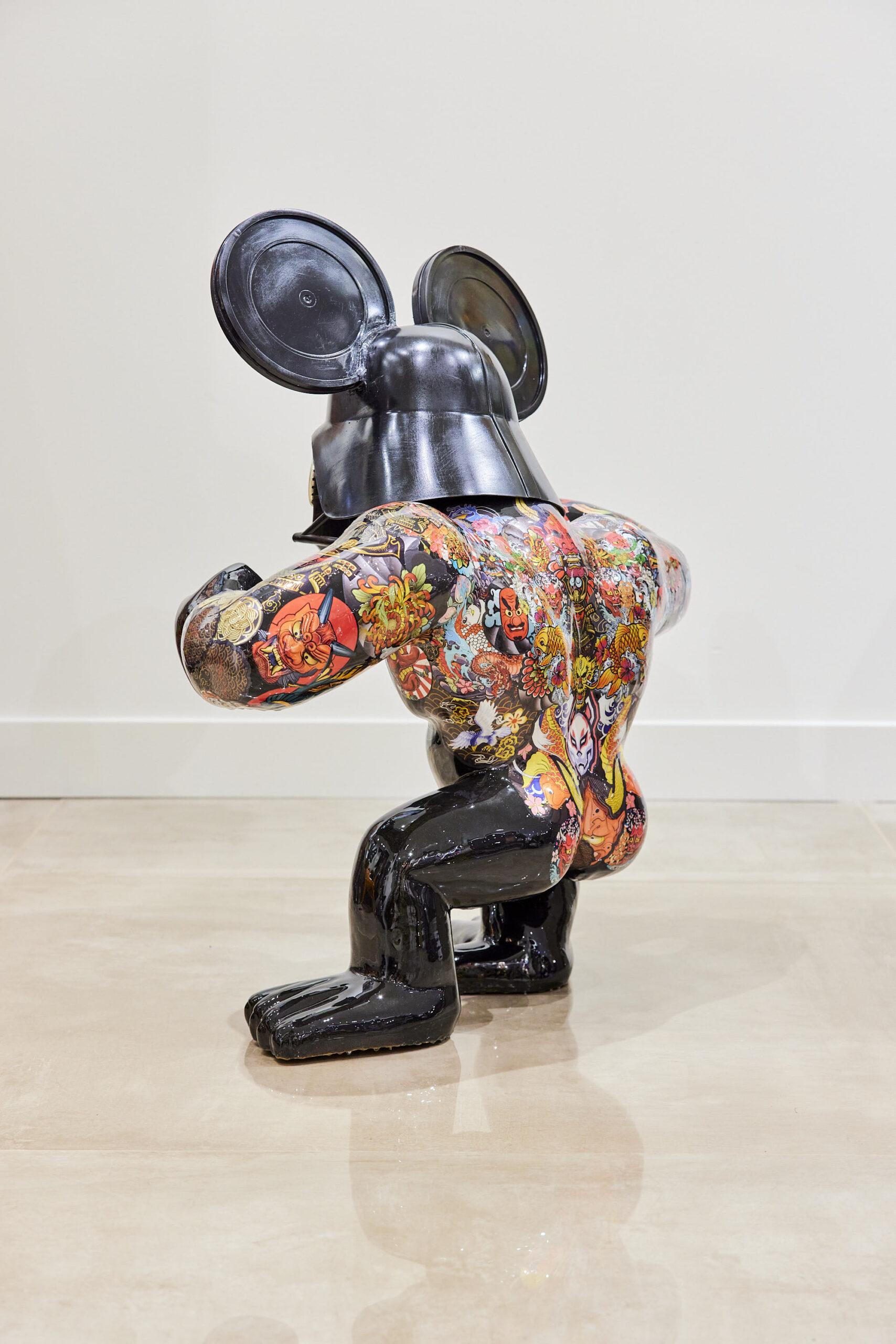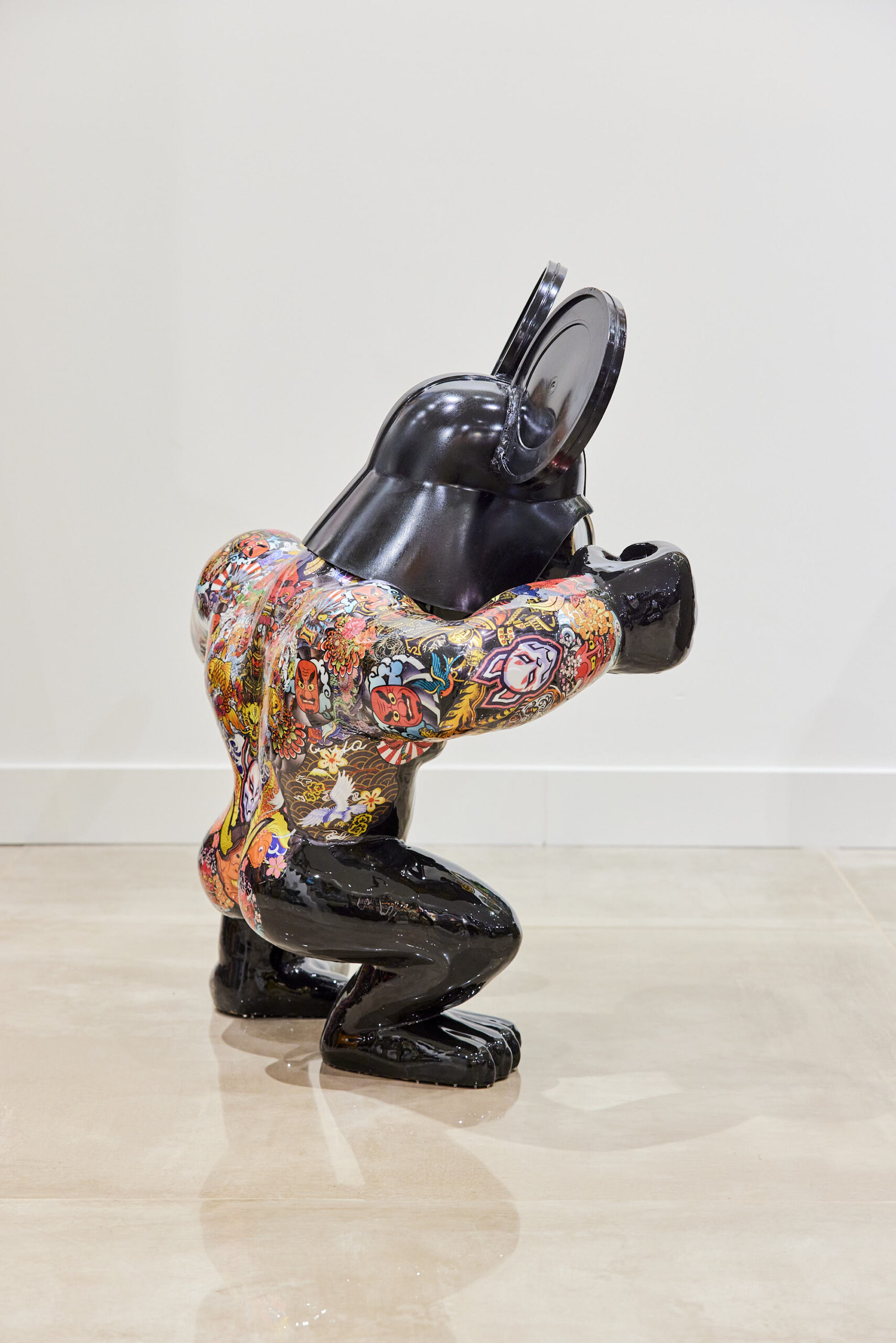 Bring a touch of edgy sophistication to your space with Mickey Darth Father, a striking and imaginative sculpture that fuses pop culture with contemporary artistry. This one-of-a-kind piece features a meticulously crafted ape figure adorned with intricate Japanese-style tattoos, symbolizing power, rebellion, and cultural fusion. The character wears a bold gas mask helmet topped with Mickey Mouse ears — a provocative blend of innocence and defiance that transforms the familiar into something entirely new. Finished with exceptional attention to detail and a glossy surface, Mickey Darth Father commands attention from every angle, making it a captivating centerpiece for any modern interior, office, or gallery. Both playful and powerful, this sculpture embodies the tension between fantasy and reality, tradition and innovation. Perfect for collectors and art enthusiasts who appreciate distinctive craftsmanship and daring design, Mickey Darth Father stands as a singular work of art — truly unique and unforgettable.