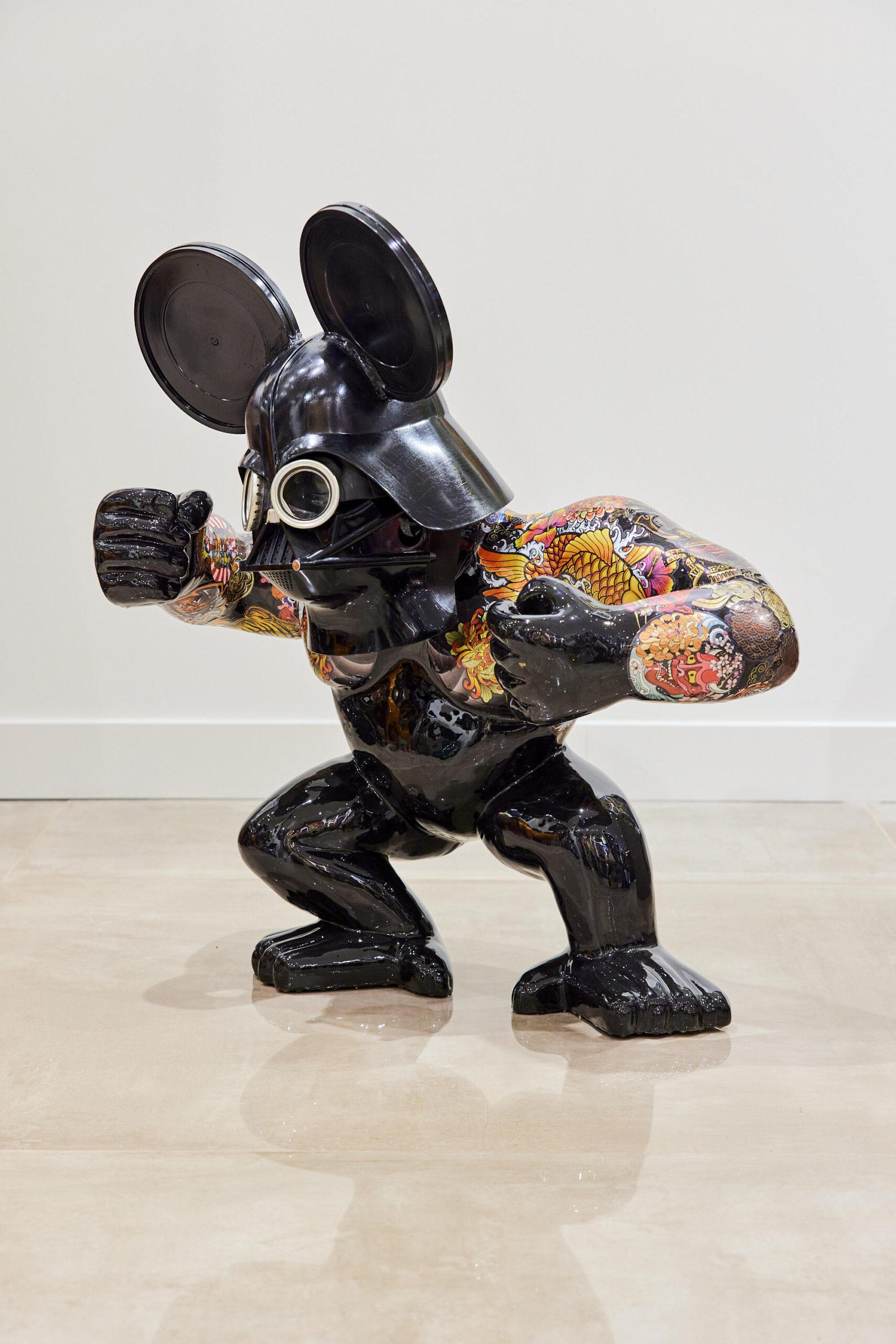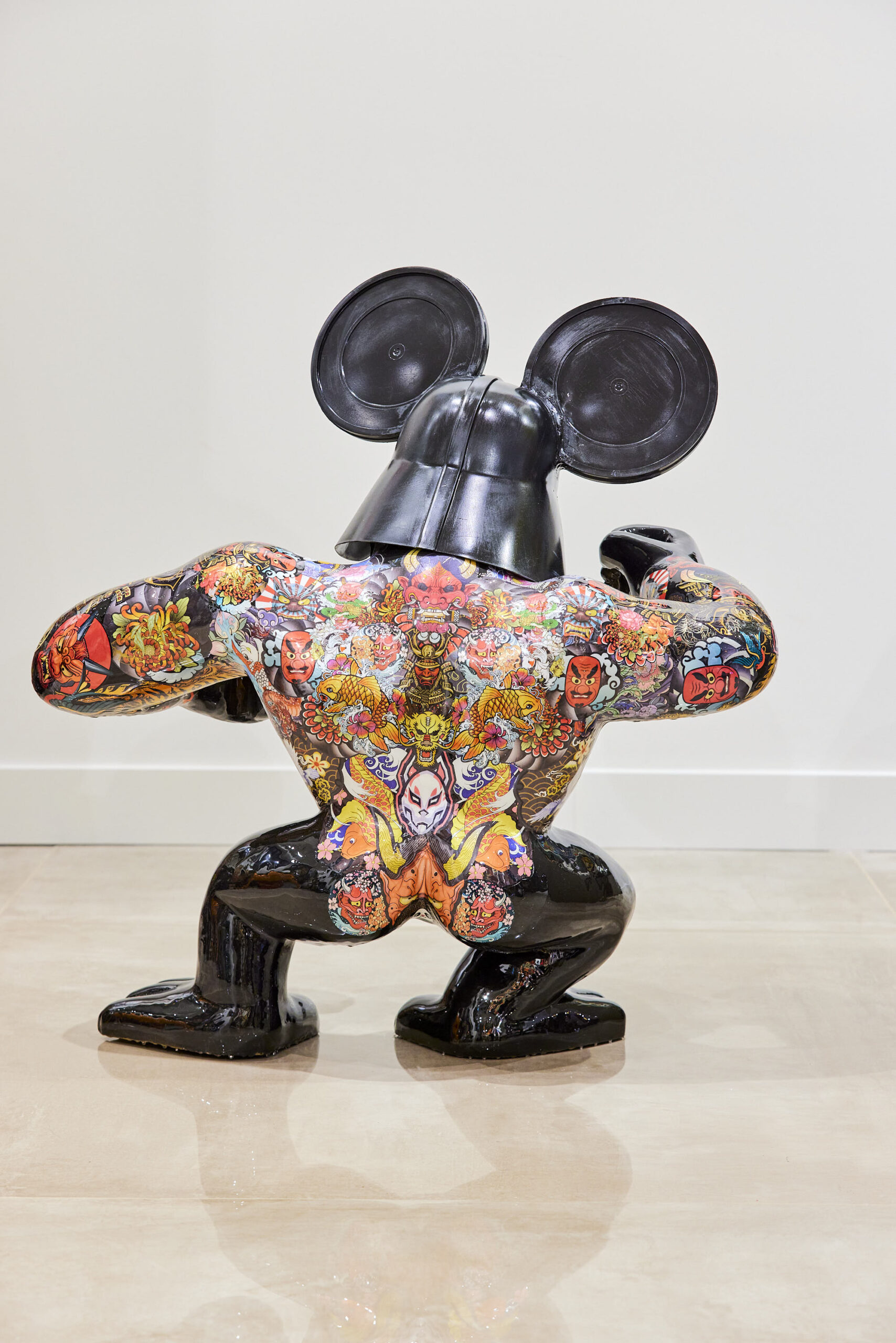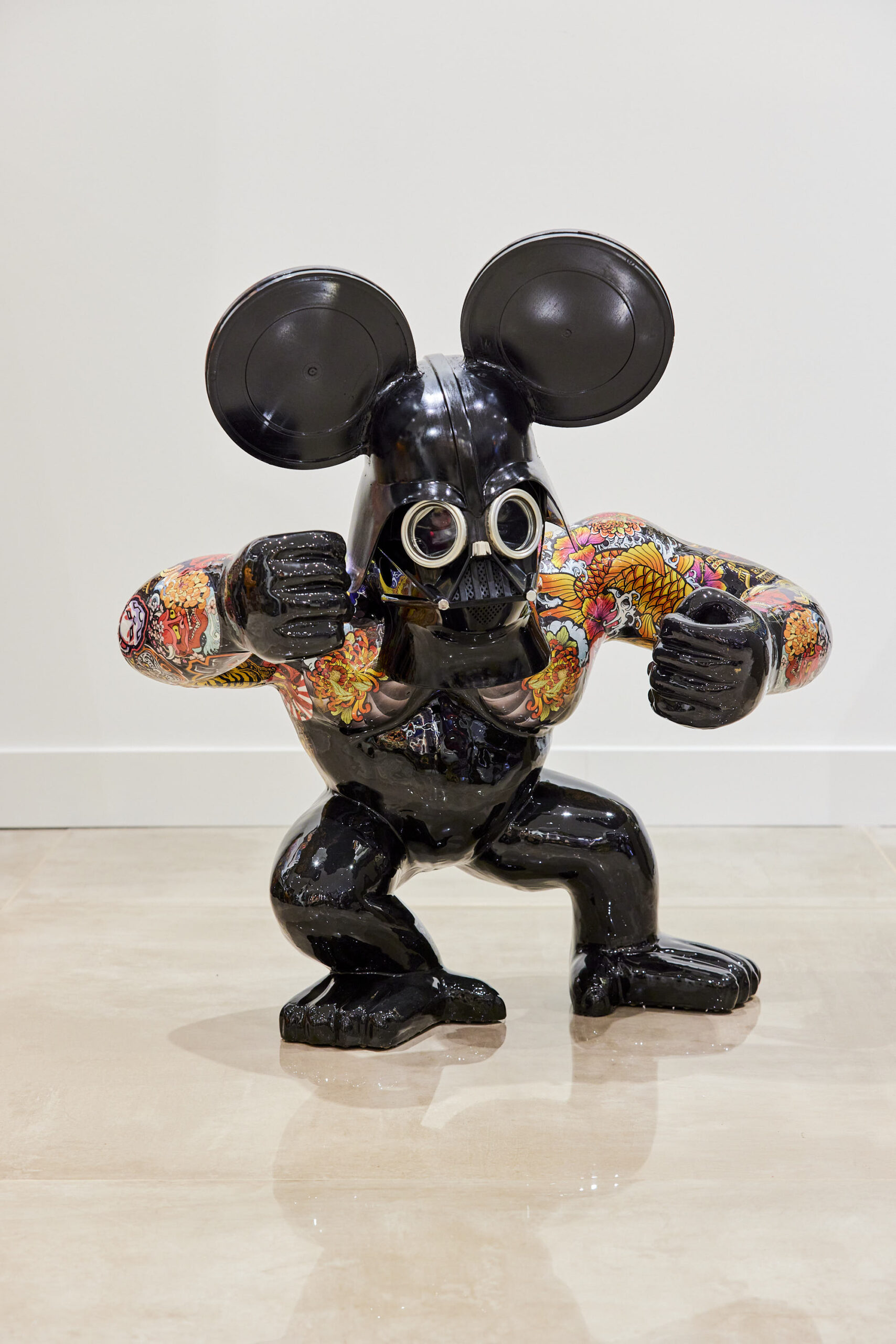 Bring a touch of edgy sophistication to your space with Mickey Darth Father, a striking and imaginative sculpture that fuses pop culture with contemporary artistry. This one-of-a-kind piece features a meticulously crafted ape figure adorned with intricate Japanese-style tattoos, symbolizing power, rebellion, and cultural fusion. The character wears a bold gas mask helmet topped with Mickey Mouse ears — a provocative blend of innocence and defiance that transforms the familiar into something entirely new. Finished with exceptional attention to detail and a glossy surface, Mickey Darth Father commands attention from every angle, making it a captivating centerpiece for any modern interior, office, or gallery. Both playful and powerful, this sculpture embodies the tension between fantasy and reality, tradition and innovation. Perfect for collectors and art enthusiasts who appreciate distinctive craftsmanship and daring design, Mickey Darth Father stands as a singular work of art — truly unique and unforgettable.